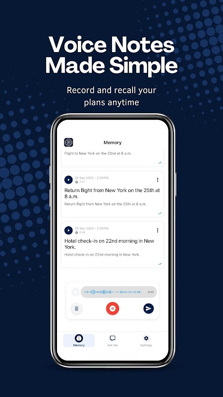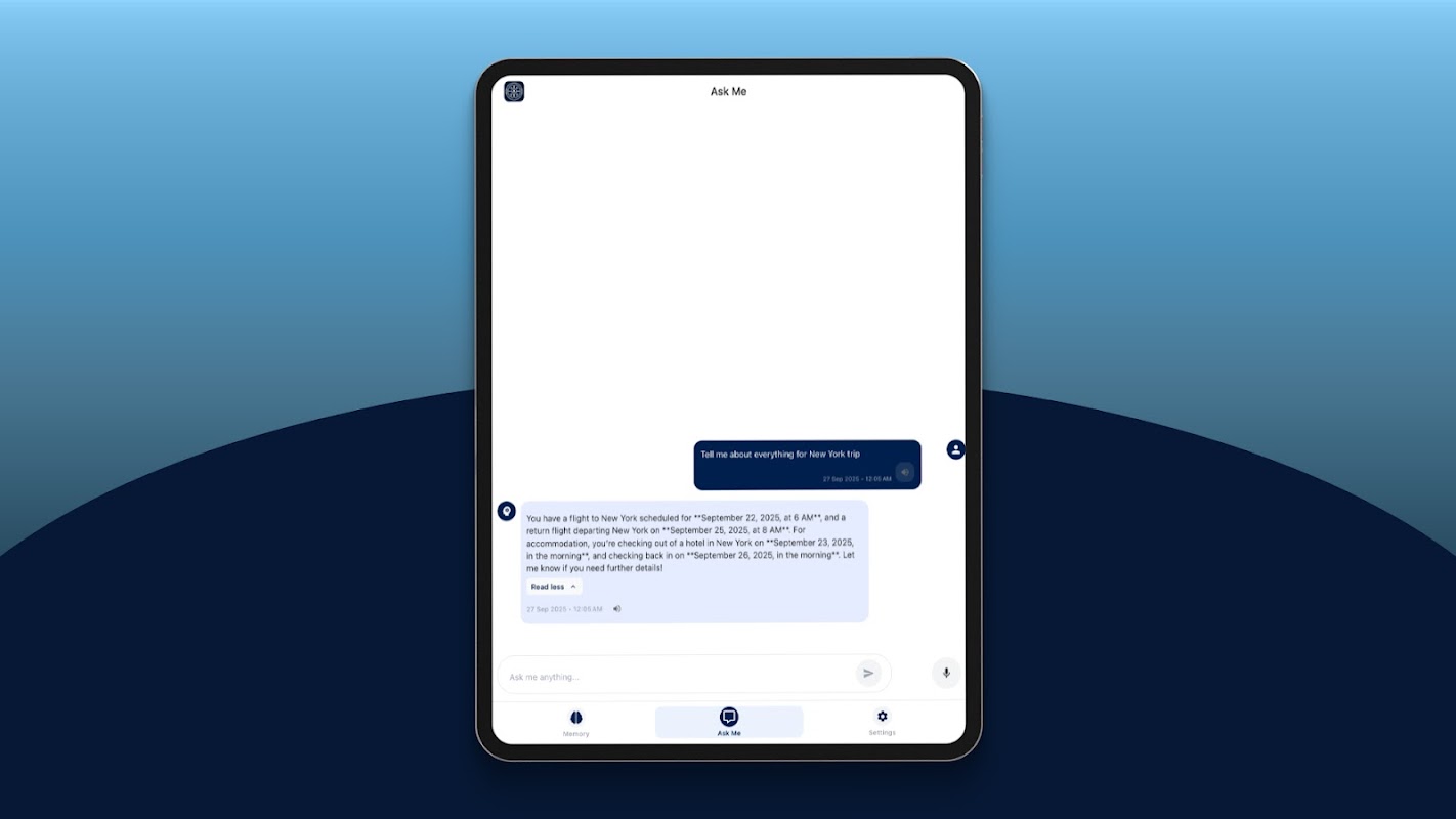 → Later just ask: “Tell me my New York trip plan.” → 22nd – Flight + Hotel check-in, 25th – Return flight