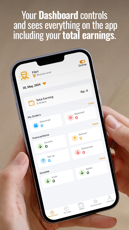 Choose to select transportation, food or delivery orders at anytime through the active jobs tab, or monitor your earnings through the detailed earnings page.