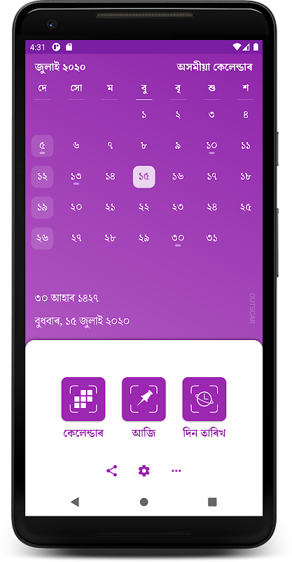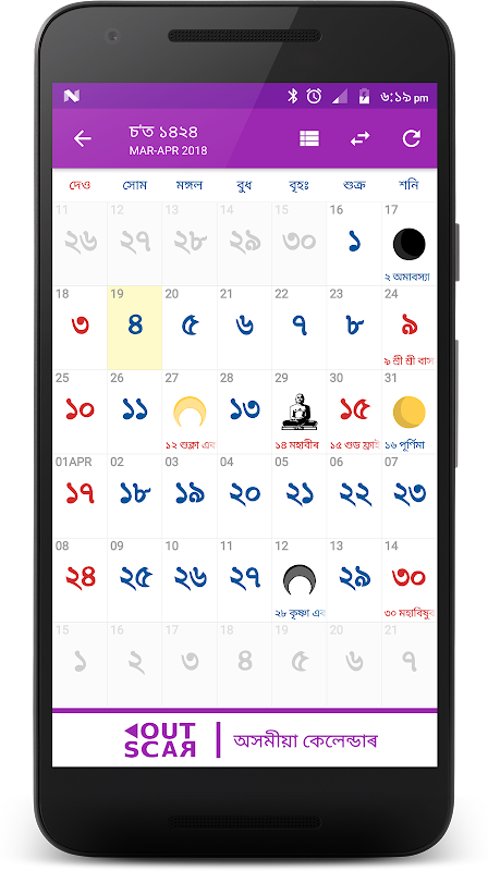 Assamese Calendar is an utility application designed in Assamese Language . It helps you with your daily needs and requirements. It is now easier to track Assamese date and year with Outscar Assamese Calendar App. It Includes the important social events , days to celebrate rituals etc.