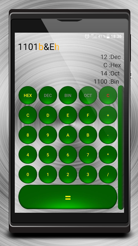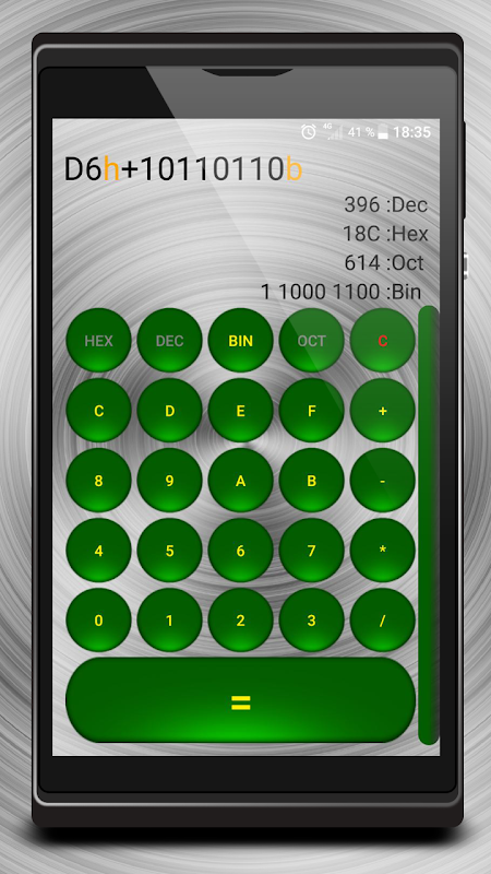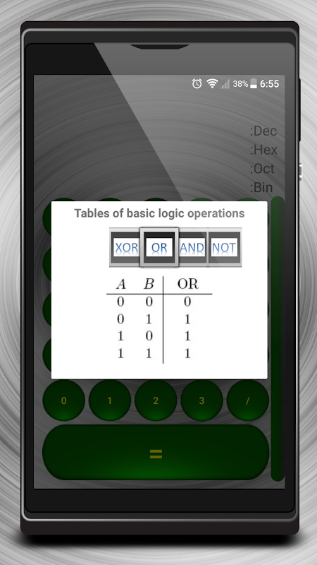 The application is designed for computer computing, in which you can add, subtract, multiply, divide and perform logical operations (XOR, OR, AND and NOT) with decimal, hexadecimal, octal and binary numbers. At the end of the number is a letter indicating the type of input number.