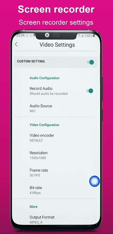 - Setting screen recording: bitrate, frame rate and sound.