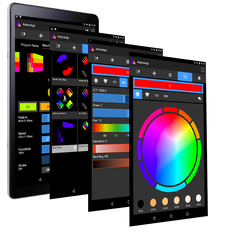 The Astera App offers intuitive and fast control of complex lighting setups with fully customizable programs and effects. It is designed to work seamlessly with other control methods such as wireless DMX. On top of this, the app offers numerous helpful tools to get the most out of your Astera lights and save time whenever you use them.
