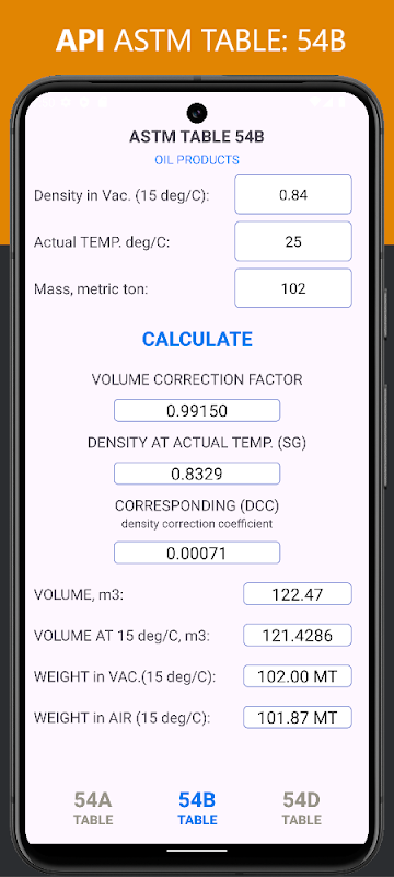 Welcome to ASTM Tables app - your ultimate tool for convenient calculation using ASTM Tables 54A, 54B, and 54D. Whether you're an engineer, scientist, or student, this app provides you with quick and accurate calculations right at your fingertips.