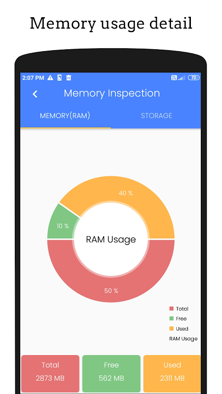 ➺Memory Inspection : Get info on Ram usage & internal storage usage(Pie chart view)