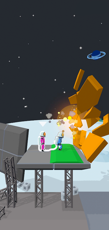 They are connected to each other, you have to calculate every move. Everything explodes around, move faster, and don't forget about your friend on the rope.