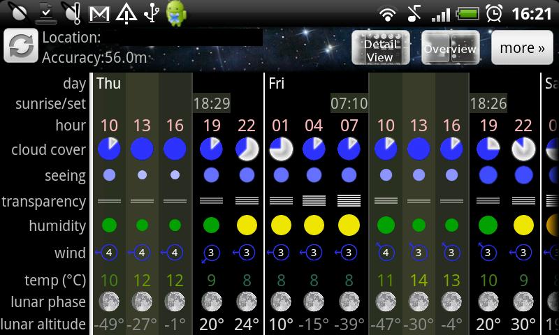 Astronomy weather forecast. Forecast data is from 7Timer! and includes: