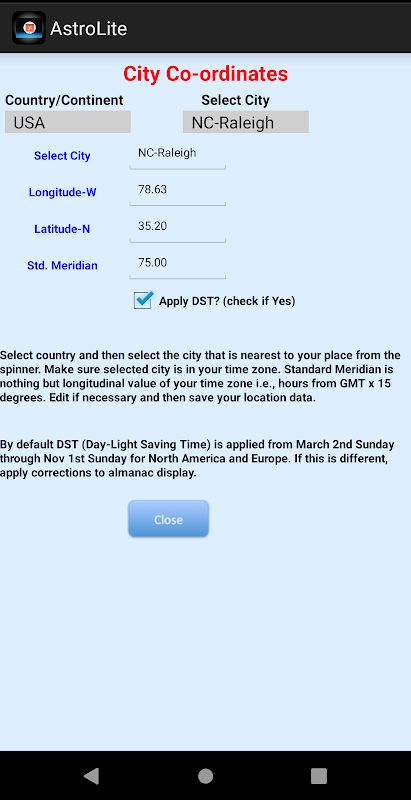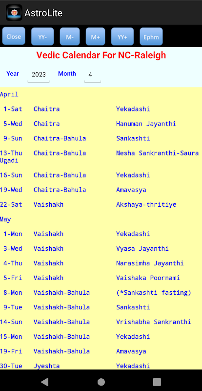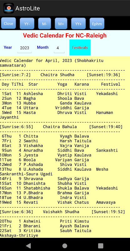“AstroLite” helps keep track of days for Vedic rituals, fast, feast and festivals. This is a basic version of AstroPro published already. While AstroPro is mainly for amateurs and professionals in Vedic astrology, AstroLite is for general public those who are interested in following Vedic traditions in day-to-day life. Users can set any major cities around the world and work with different key menu categories with its features discussed as follows.