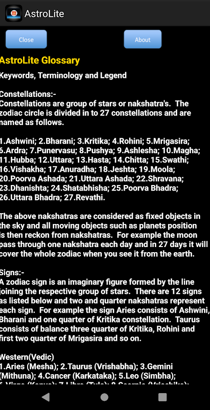 Help file provides a Vedic almanac glossary with brief writing on various keywords, terminology and legend used in different sections of this app. It is quite educational and people can quickly comprehend its significance with different computational logic used for the purpose.