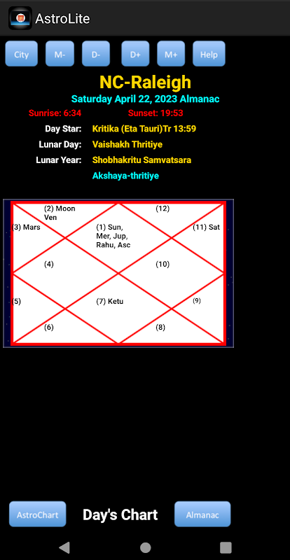 This provides current calendar date with Sunrise, Sunset, day’s star with its transition time, lunar month, tithi and year followed by any major festival events for the given city of choice. Users can navigate through days and months for the current year that gives corresponding Vedic almanac details as well as charts for planetary positions. Charts can be displayed under South or North Indian formats. One can quickly switch between these chart formats using the tool bar button as shown in the screen shots.