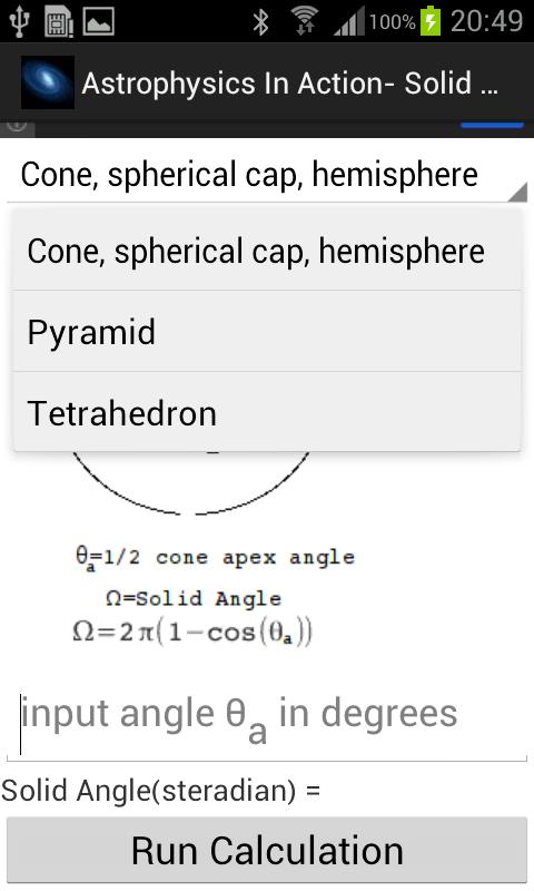 Some topics in Astrophysics has its group of formulae , of course; therefore, each is accompanied with some information about it by clicking the menu button.