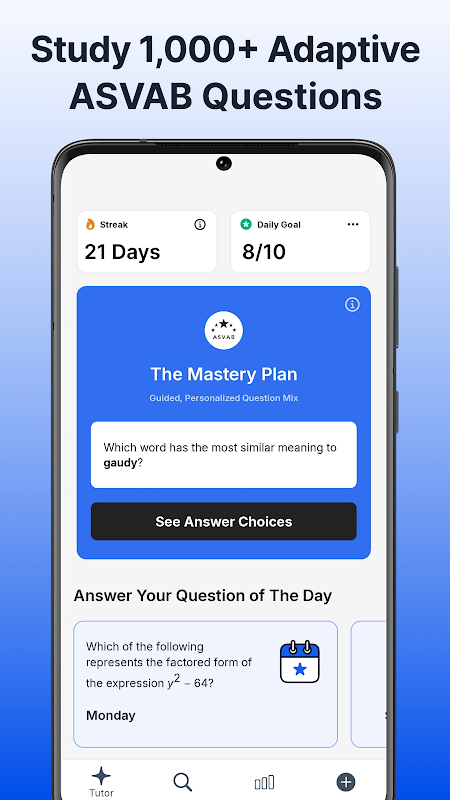 ASVAB Mastery offers 1000+ ASVAB practice questions covering all ASVAB test sections. Our app is designed to provide a comprehensive ASVAB challenge that tests your knowledge, skills, and abilities across all areas of the test. With our army study guide, you'll get instant feedback on your performance, including detailed explanations for each question you get wrong. US Army ASVAB challenge!