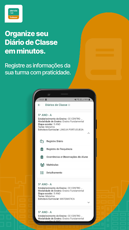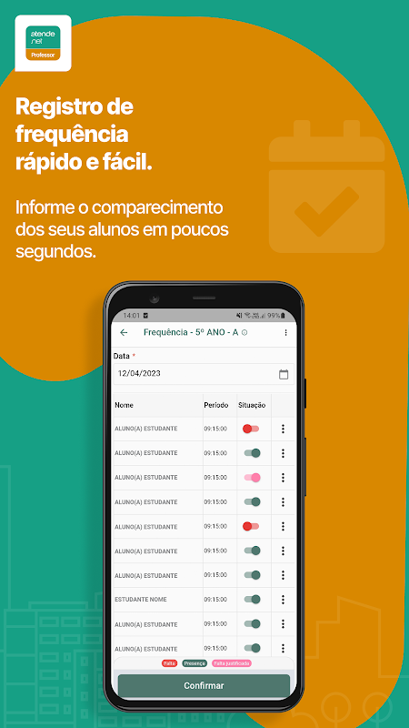 Through the Attend.Net Professor® application, teachers can record information from all their classes with greater convenience. The application allows you to access several schools where the professor teaches classes, record information about the class, such as student attendance and occurrences, and keep informed about changes in enrollments and attendance of each student, among other resources.