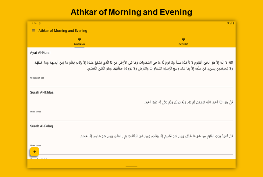 This App "Athkar of morning and evening" offers a collection of prayers; which are recited at sunrise and sunset times that are displayed in a modern look and has the following characteristics: