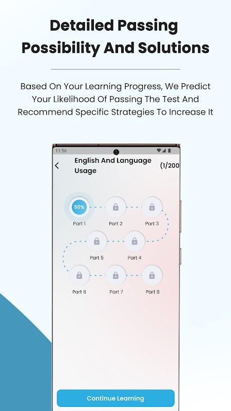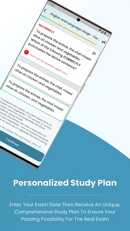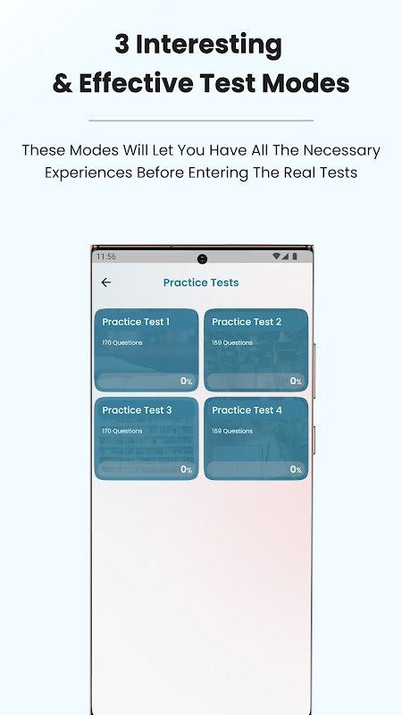 • Mock test: Various full tests let you familiarize yourself with test format. When you finish the test you will see your score and review all the questions.