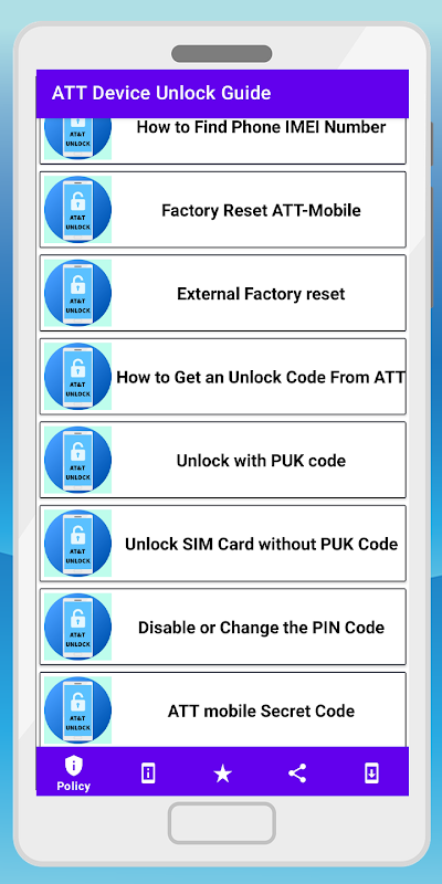 Get ATT Device Unlock Guide from this app. How to Unlock AT&T Mobile. AT&T Phones Network Unlock Codes. T-Mobile device unlock Method Guide. Factory Reset AT&T Mobile. Unlock SIM Card Without PUK Code Guide.