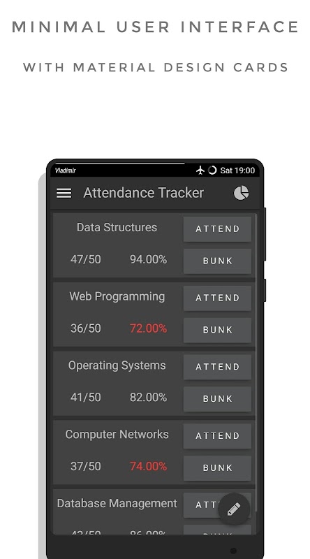 The Attendance Tracker app, allows you to add your Subjects, Lectures Information & In return, helps you by providing individual & overall percentage of your attendance.