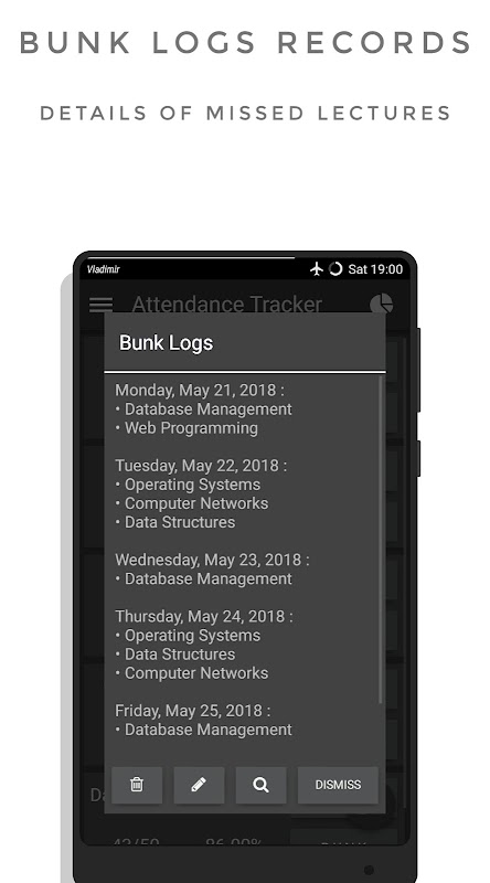- Bunk Logs option in Statistics section keeps a detailed record of your absent lectures with accurate date.