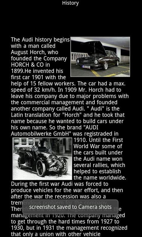 This app includes all models made by Audi throughout the years from the A1 to the R8. Each model has its own photo and video gallery.