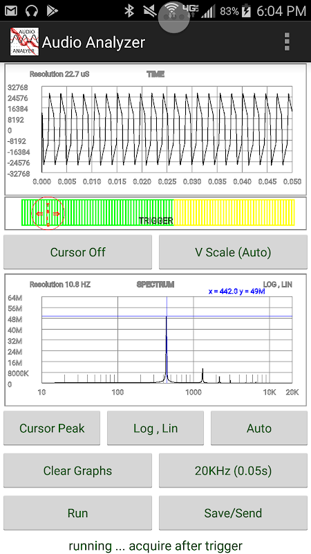 Launch the application. The cursors are initially off, frequency range is set to 20Khz, and vertical scales are set to Auto mode. Pressing the Run button will start acquisition if the input amplitude is greater than the trigger level. Adjust the Trigger level for the desired sensitivity by moving the red circle on the trigger slider. The Freq(Time) button produces inverse results on the time and frequency graph. A wide frequency setting of 20Khz will produce a very small time sampling window of 0.05 seconds. Conversely a 1Khz frequency range will produce a sampling window of 1 second. A Cursor is available for each graph. Pressing the cursor button one time will set it to peak mode. The peak (positive) will be shown on the graph with cross-hairs on the graph; its x,y coordinates are displayed in blue font on the upper right side of the graph. Pressing the cursor button again will allow the cursor cross- hairs to be dragged to any data point on the graph. The x,y coordinates of this point are displayed in blue font on the upper right side of the display.