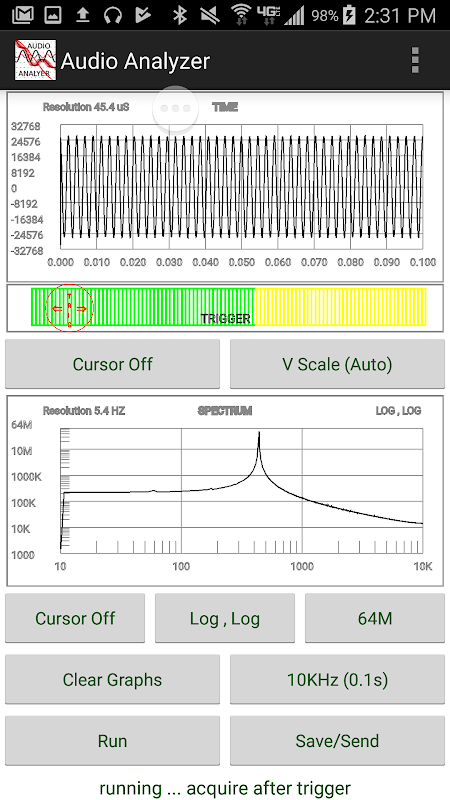WithStrings simple Audio Analyzer acquires a signal from the device's microphone and displays its time history and Fourier amplitude frequency spectrum (using a FFT algorithm). Sampling of the time history starts when the amplitude of the audio acquired at the microphone is greater than the adjustable trigger level slider. The length of acquisition is adjustable from 0.05 seconds to 1 second. Vertical scales for each of the graphs are independently adjustable or can be set to auto-scale.