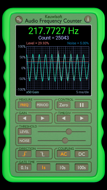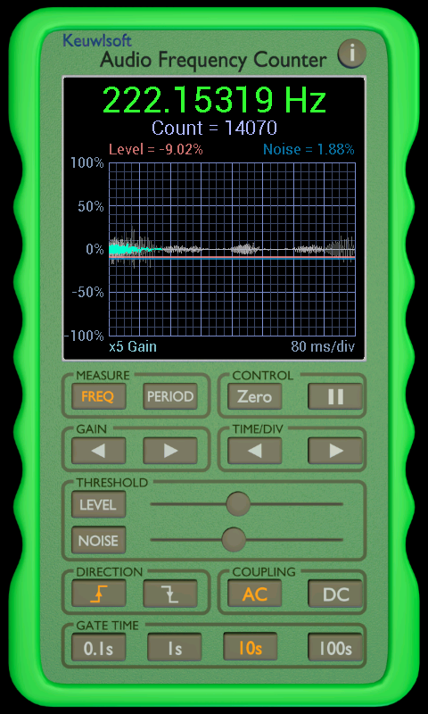 Frequency counter based on the microphone input. Counts when the input rises or falls past a set level and converts into into frequency or a time period. FOR INDICATION ONLY. Results depend on your device and its hardware. If you just want to know the frequency of a sound with harmonics (e.g. musicial instrument), a FFT based app such as keuwlsofts spectrum analyser or guitar tuner will be better. This app can provide more accurate frequency measurement for single frequency input signals. Features include: