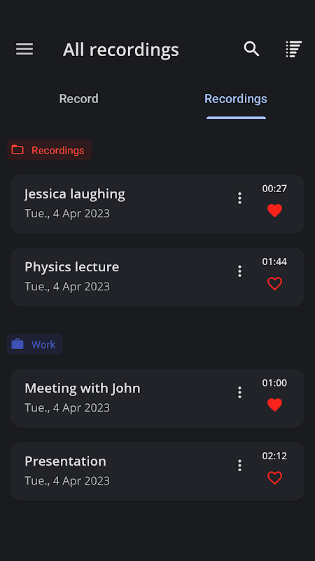 Audio Recorder is mostly known as free, professional and easy dictaphone for Android devices. Use it for record voice memos, talks, singing, music and sounds in high quality. Designed for everybody, especially students, journalists and musicians. Tags can be easily added to any part of the recording by one tap. Voice Recorder recording quality is limited by the quality of device's microphone.