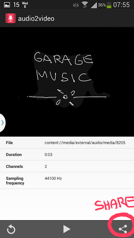 The Audio 2 Video app takes any sound file (MP3, WAV,..) and transforms it into a video file (MPEG-4) which can be shared and uploaded to popular video channel. Change your audio files to videos instantly from your phone.