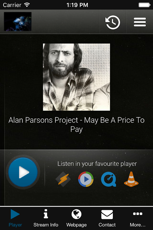 There is a player for each stream, with track and artist details from Last.fm, Facebook and Twitter integrations to the station, "Stream info" page with map of listeners. Artist biography for each stream and every track played. Links to the website.