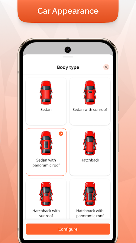 - Personalization. Allows you to choose the car's body and color for accurate display in the app and to customize the dashboard.