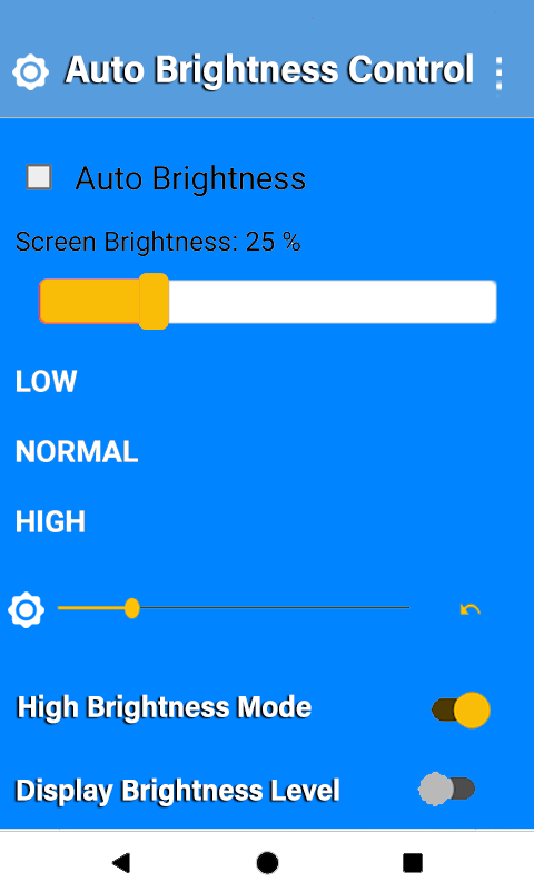 Switch the brightness of display screen between low, normal and high brightness levels or create a custom brightness level to apply. You may enable the auto brightness to adjust brightness depending on the light. Brightness control app renders the custom brightness to create own set of brightness with name and number of percent to set a custom brightness for display screen in mobile. In addition, you can add the custom brightness in a list to enable them with full ease and access.