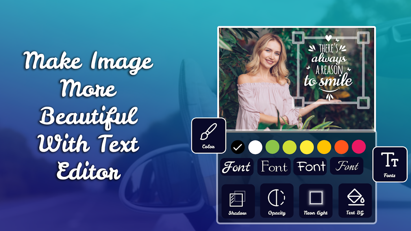 Add Text on Photo very quickly and easily to use. set your daily Thought, Emotion & Love on photo with various Text style, Colors, Fonts, Shadow, text BG color, Neo light and many other filter of text.
