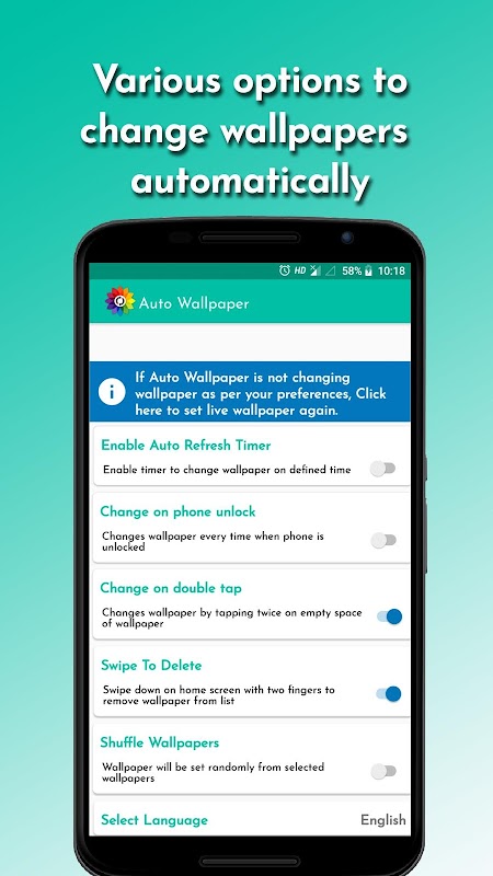 Changes wallpaper automatically by double tap, phone unlock and scheduled time