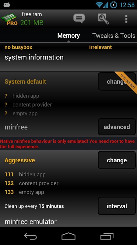 - ROOT REQUIRED to set minfree values, unrooted devices will only have an emulation of this feature