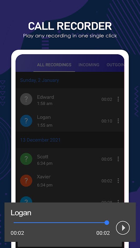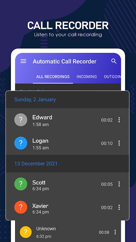 Automatic All Call Recorder keeps complete track of you all incoming & outgoing calls and you can manage each recording individually.
