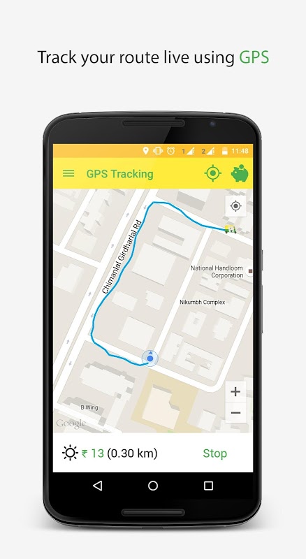 Also, you can track your travel route. What you have to do is, open the app before you get into the auto-rickshaw, go to the "GPS Tracking", and tap on "Start" button. After that, you can say to the Rickshawala, "Ab chalo bhaiya!". The app draws the root you are traveling. Once you reach to your destination, you can tap on "Stop" button, which stops tracking your travel. It shows the distance (in kilometer) you have traveled and the fare calculated based on that.