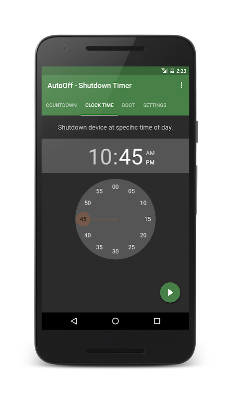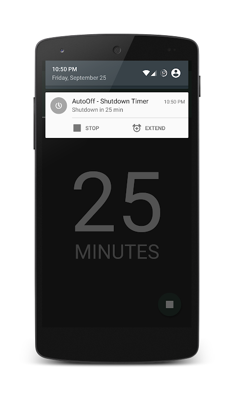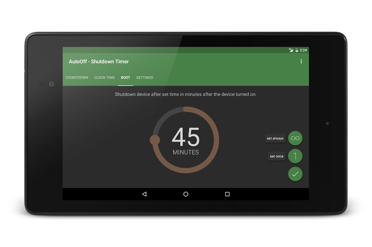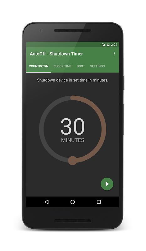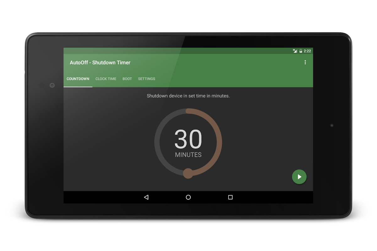 AutoOff allows you to automatically shutdown your device at a set time. You can schedule the timer either in minutes until shutdown or set the exact time of shutdown. Furthermore you can set the timer to automatically start on boot.