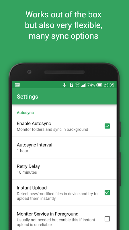 • Configurable autosync interval: 15 minutes, 30 minutes, every hour,...