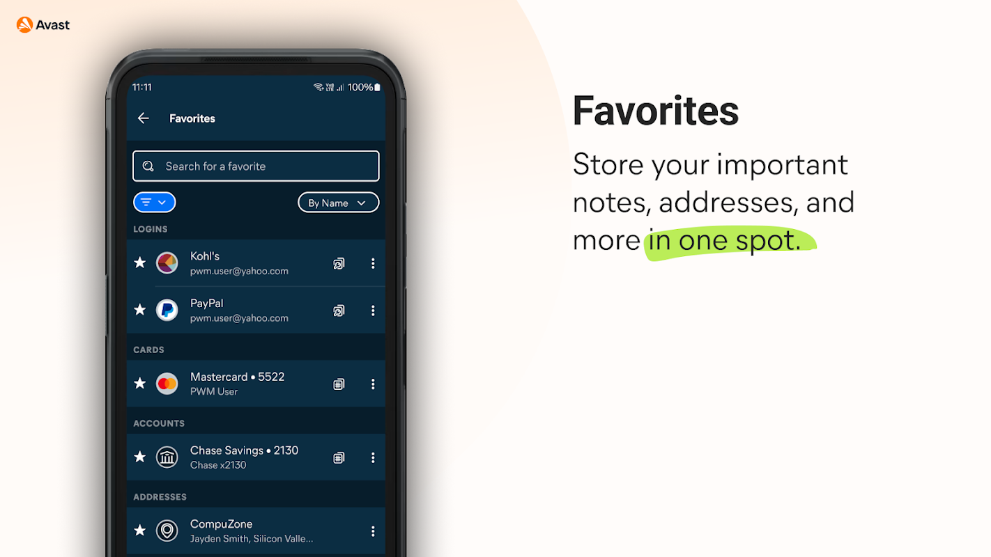 Easily secure all your passwords, credit cards, addresses, and sensitive information across the web and on any device with Avast Password Manager mobile app*.