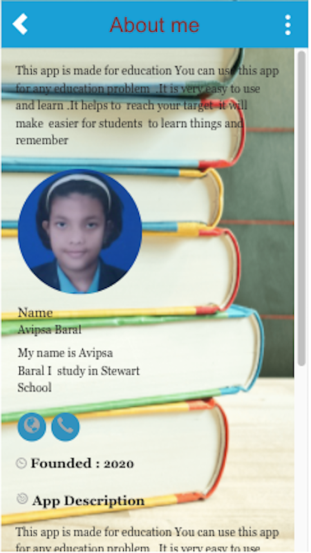 This app is made for education You can use this app for any education problem .It is very easy to use and learn .It helps to reach your target it will make easier for students to learn things and remember