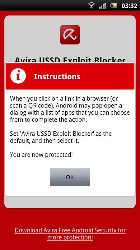 When you click on a web link or scan a QR code, Android will open a dialog with a list of apps that you can choose from to complete the action. Select ‘Avira USSD Exploit Blocker’ and set it as the default.