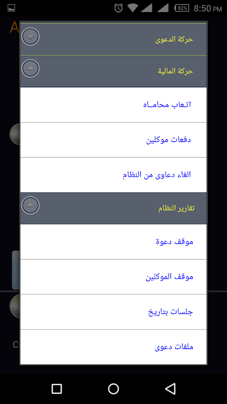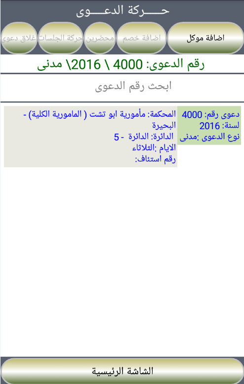 This section provides a program of case management office through the introduction of screens from which to establish a new suit and the addition of clients and liabilities and also record the timing of the hearings with the possibility of adding the papers used for the claims of some photographed and make it indexed each lawsuit separately. Also it offers some reports that help Gentlemen lawyers follow the movement of each case.