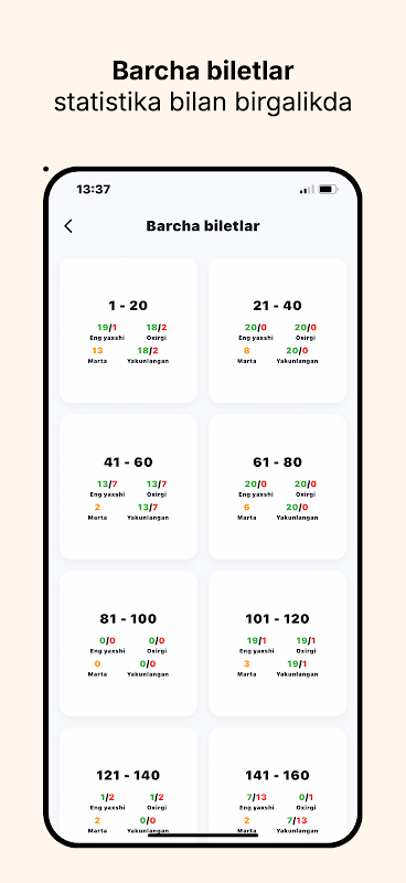 Oldin o'tgan imtihonlarni qayta ishlash imkoniyati. O'tgan natijalaringizni ko'rib chiqing va yaxshilash ustida ishlang