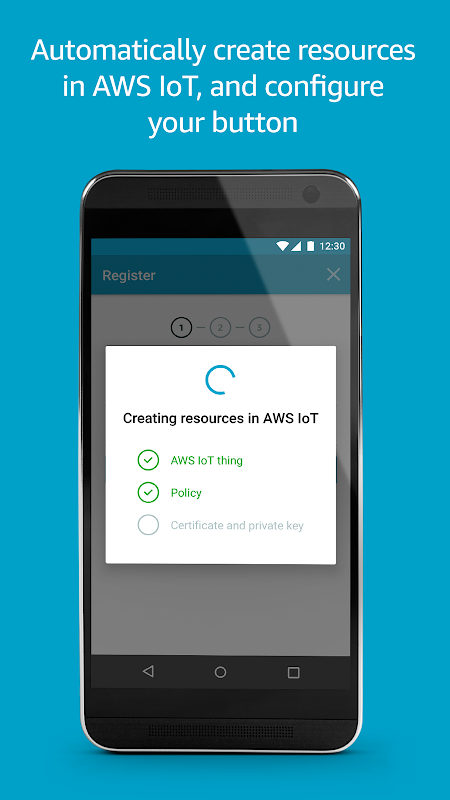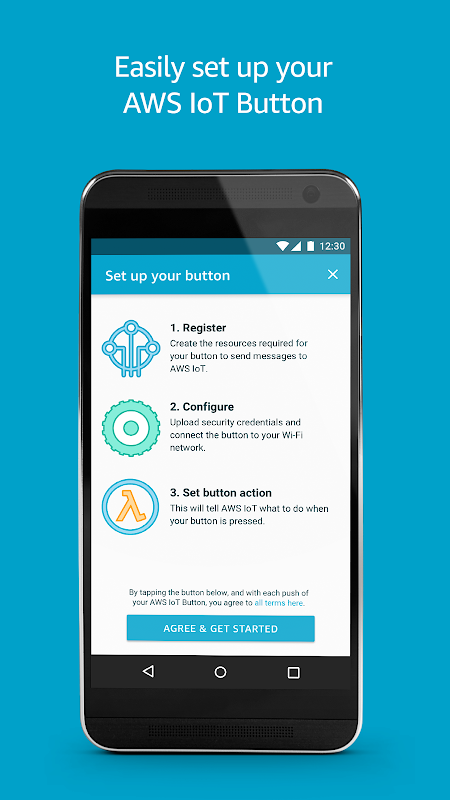 This app walks you through a few easy steps to get your AWS IoT Button up and running: (1) Register - create the resources required for your Button to send messages to AWS IoT, (2) Configure - upload security credentials to your Button and connect it to your Wi-Fi network, and (3) Set Button action - use Lambda functions to trigger events in the Cloud.