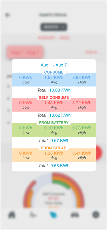 - Display of the values relating to photovoltaic production, energy exchange with the grid, the consumption of your home and the contribution of the batteries in terms of charge and discharge.