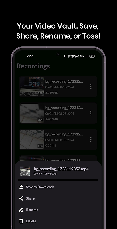 Background Video Recorder helps you record videos smoothly even when the app is closed, while using other apps, or when your screen is off / phone is locked (device support may vary). It’s built for reliable recording, easy controls, and powerful storage management — all in one clean app.
