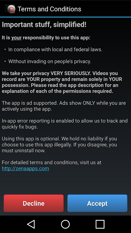 Background Video Recorder 2 is developed and distributed by Zena Apps. All rights reserved. This app is licensed, not sold. By downloading the app, you accept our EULA available on our website at http://zenaapps.com. App is licensed for individual, private use only. For use by companies, please contact us for corporate license information.