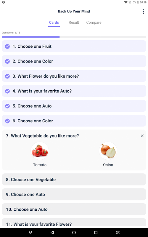 Have you long wanted to explore the chambers of your mind? Then the "Back Up Your Mind" quiz is a unique way to define your worldview and share your preferences. This application is developed to create your own user profile based on your preferences. The great thing is that you can monitor how your points of view change throughout the year and then compare your results and draw conclusion. Moreover, if you want, you can compare the preferences of your friends and yours and then discuss the results obtained. Additionally, based on your completed profile, our app can offer your different ideas on how to spend your time. We are sure that you'll enjoy this playful way to relax.