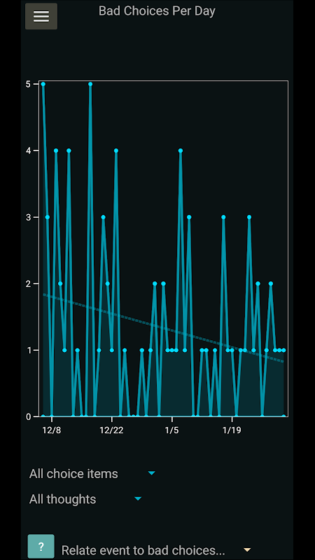 Analyze your bad choice history, with optional filters for thoughts and choice items. Trend it against any of your daily event's history.