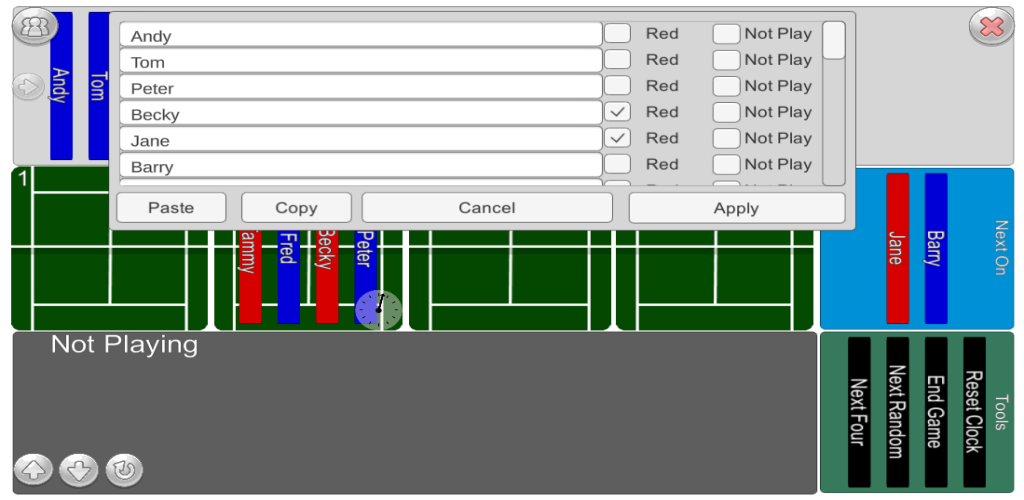 Tools include next random 6 player, next 4 player, reset clock, end game.