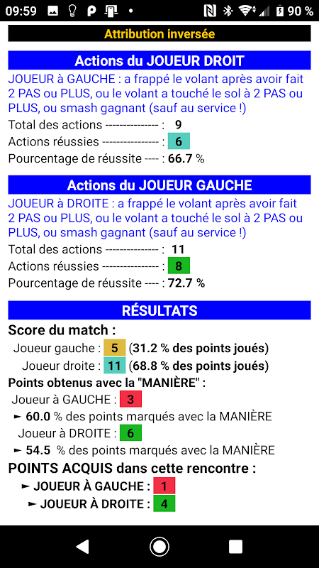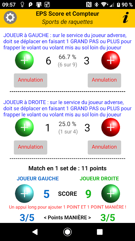 The application for BADMINTON which associates the follow-up of the score between 2 players with the optional reading of an action (predefined or to be defined by the user of the application). The points scored by the player and his opponent can be valued by obtaining "manner" points. The number of "manner" points to be obtained and the bonus acquired can be configured. The bonus induces the number of points or shuttlecocks obtained at the end of a match (in case of victory or defeat).